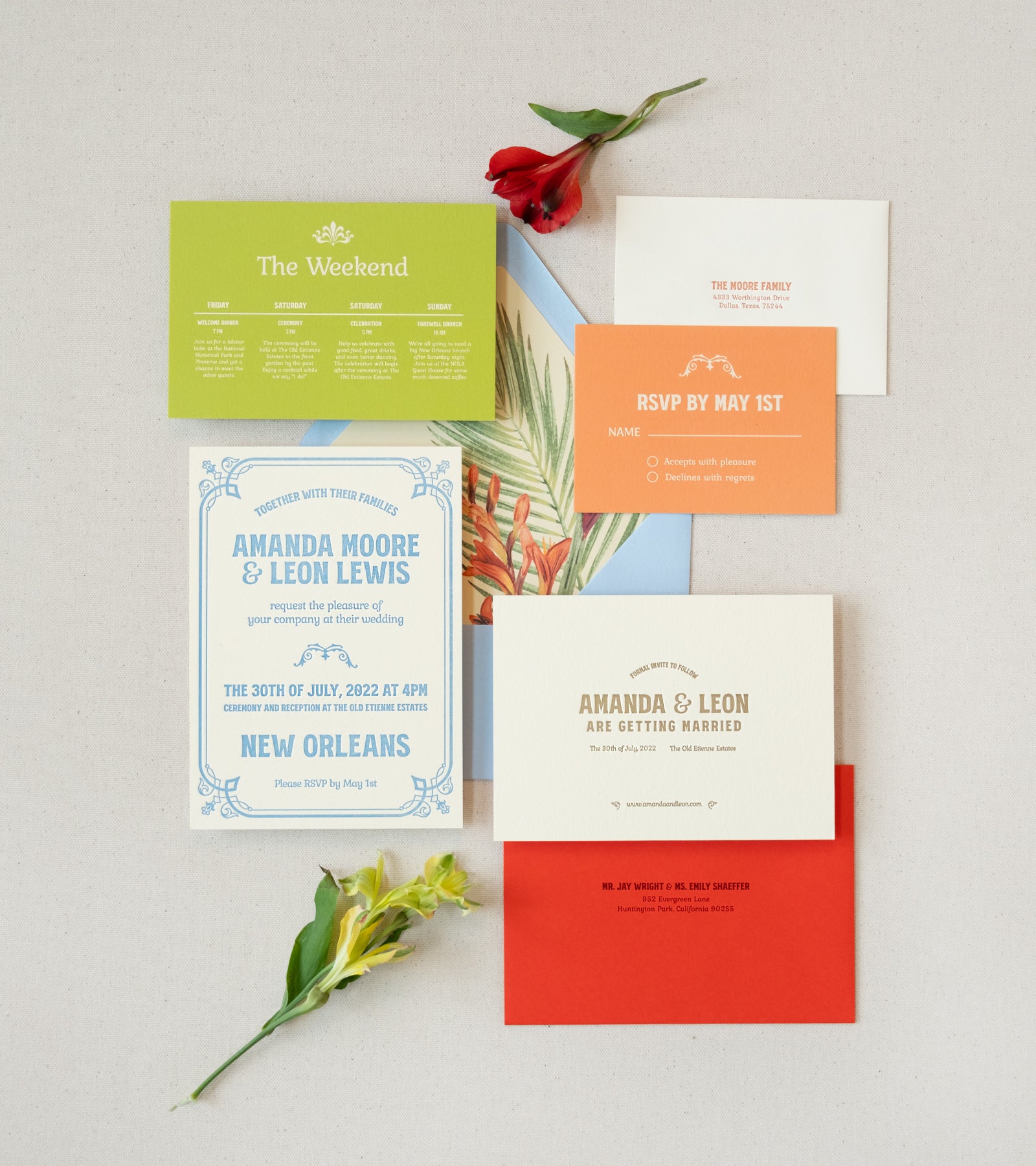 Infuse your wedding with the vibrant energy and festive charm of the New Orleans with this bright, colorful wedding stationery collection.