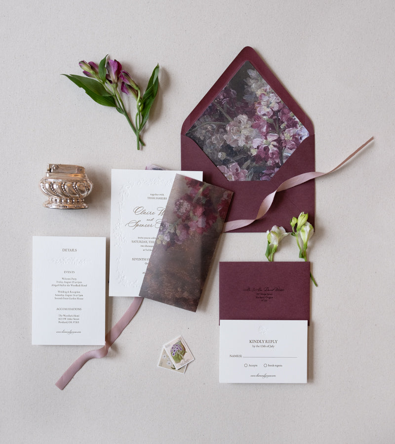 Indulge in the luxurious intimacy of this romantic wedding stationery collection, where passion and elegance intertwine.