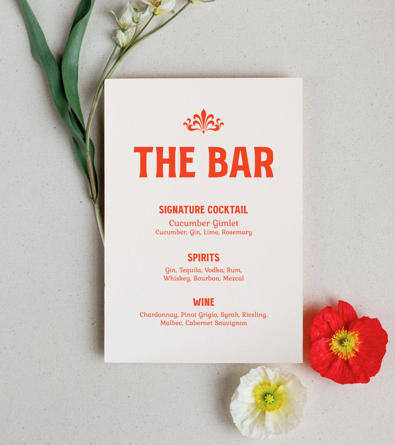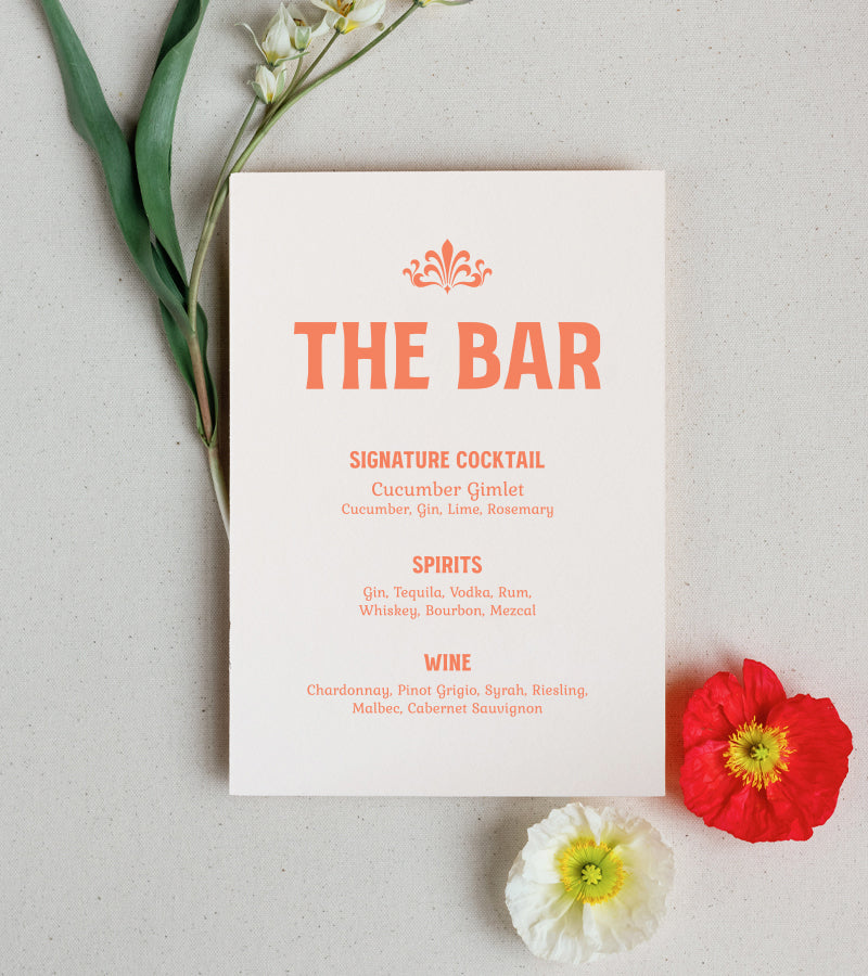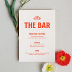 Add a touch of flair and sophistication to your wedding with the New Orleans Vintage Bar Menu! The eye-catching Cayenne red font pops against the linen colored background, making it easy for guests to find and read. This beautiful and practical bar menu is a detail your guests won't want to miss!