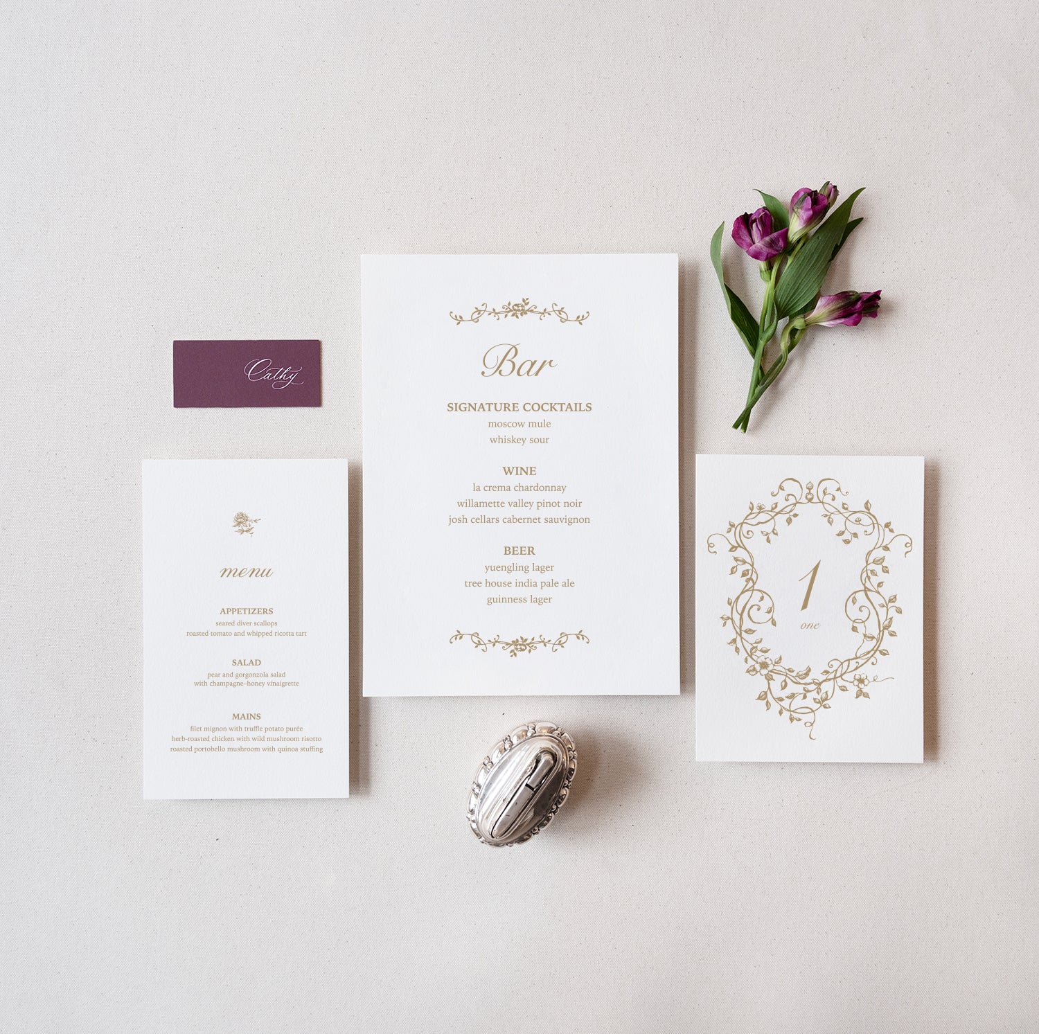 A subtle detail that makes a lasting impression. Select antique gold, espresso brown, or soft charcoal ink to personalize your dinner menu, bar menu, and table numbers. (Image left compares antique gold and soft charcoal)