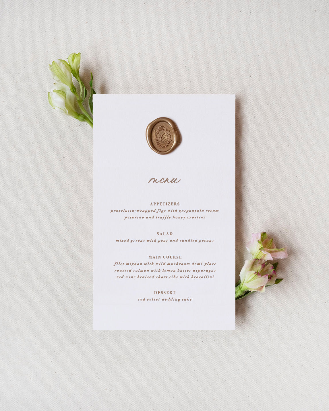 These regal wax seal embellished Secret Garden Dinner Menus will surely wow the guests! The romantic script seamlessly coordinates with the Secret Garden Invitation Suite and Day-of-Signage, extending the elegance of your stationery to the dining experience.